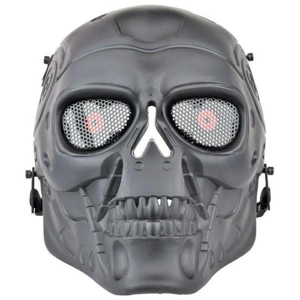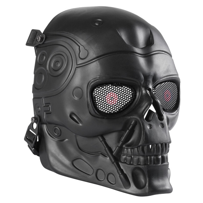 Ochranná štýlová čierna maska model Terminator pre airsoftových hráčov, ktorá Vám ochráni celú tvár. Očný priezor je chránený kovovou sieťkou, ostatné časti sú plastové. Veľkosť je univerzálna, nastaviteľná. Rozmery sú 210 x 260 mm a hmotnosť je 300 g.