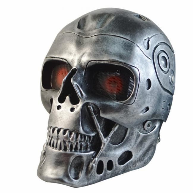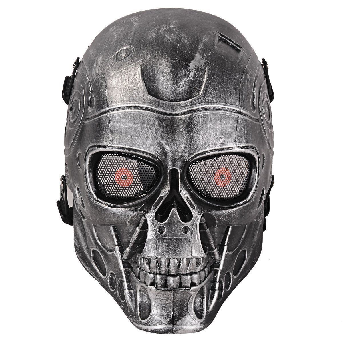 Ochranná štýlová strieborná maska model Terminator pre airsoftových hráčov, ktorá vám ochráni celú tvár. Očný priezor je chránený kovovou sieťkou, ostatné časti sú plastové. Veľkosť je univerzálna, nastaviteľná. Rozmery sú 210 x 260 mm a hmotnosť je 300 g.