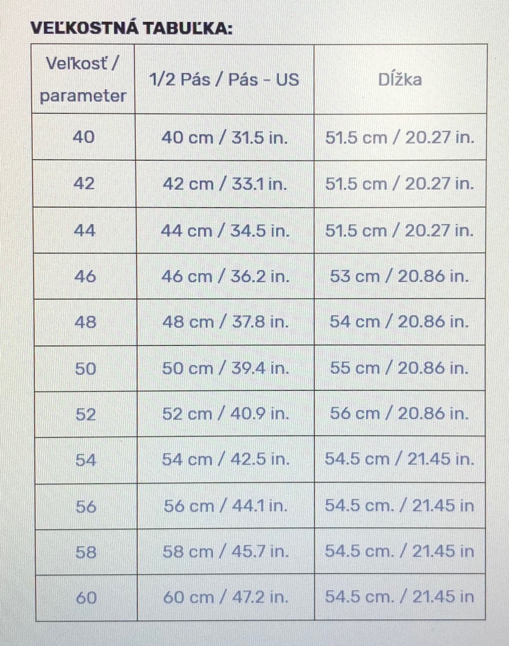 – uvedená veľkosť znamená polovicu obvodu v páse v cm (napr. velkosť č.40 = 80cm v páse)
