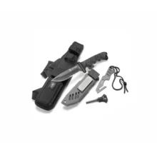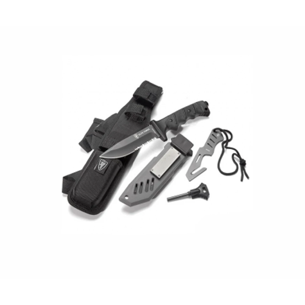 Elite Force 703 SET je výrobkom kvalitného popredného výrobcu zbraní Umarex. Obsah balenia tohto produktu tvorí SET pevného noža s kombinovanou čepeľou, plastovým puzdrom, puzdrom na nohu, kresadlom a záchranným nástrojom so skrytou čepeľou. Ide skutočne o jedinečný pevný nôž na prežitie s nevšedným, originálnym estetickým spracovaním, dizajnom (vysokou kvalitou, typickou farbou, značkou) okamžite dešifruje svojho špičkového výrobcu zbraní UMAREX (Nemecko). Samozrejmosťou je čierna kombinovaná čepeľ 420 Stainless Steel.