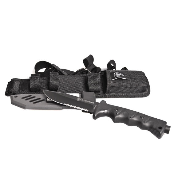 Súčasťou balenia noža Elite Force 703 SET je taktiež puzdro na nohu, plastové puzdro, ktoré slúži ako brúska, očko pre opasok s kresadlo.