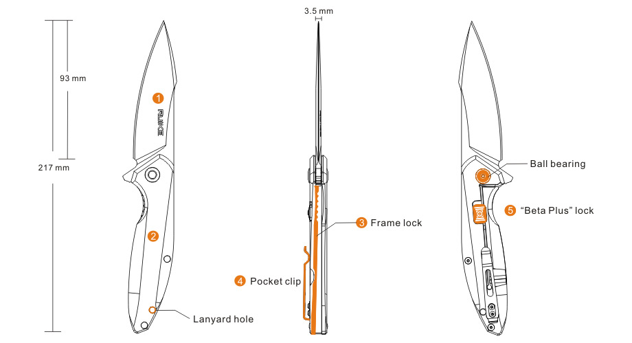 Zatvárací nôž Ruike P128 so silnou čepeľou je vybavený páčkou flipper pre rýchle a pohodlné otvorenie. Rúkoväť je vyrobená z nerezovej ocele. Proti nechcenému zatvoreniu je nôž vybavený poistkou Frame Lock, ktorú sa dá zaistiť zámkom Beta Lock. Nôž je vybavený sponou pre uchytenie vo vrecku, taške a je ideálny pre každodenné nosenie.