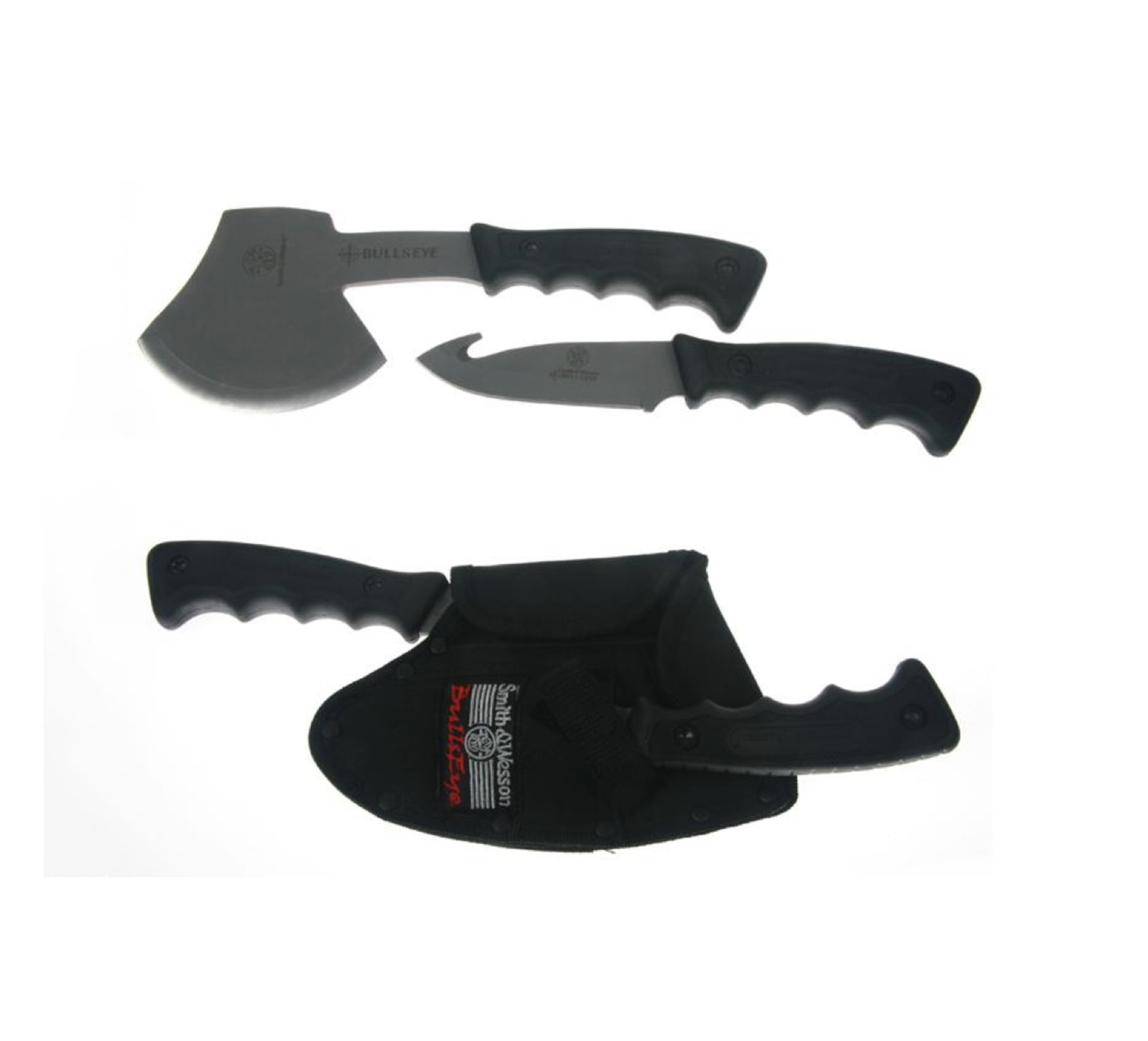 Sada loveckého noža s pevnou čepeľou Bullseye a sekery Combo od Smith & Wesson. Obe majú čiernu pogumovanú rukoväť a sú v puzdre Cordura s putkom na opasok. Čepeľ je z nehrdzavejúcej ocele 440 C. Nôž je vhodný na lov a na konci čepele má paráčik. Sekera má dĺžku čepele 15,24 a celkovou dĺžkou 27,30 cm. Nôž má dĺžku čepele 11,43 cm a celkovou dĺžkou 24,13 cm