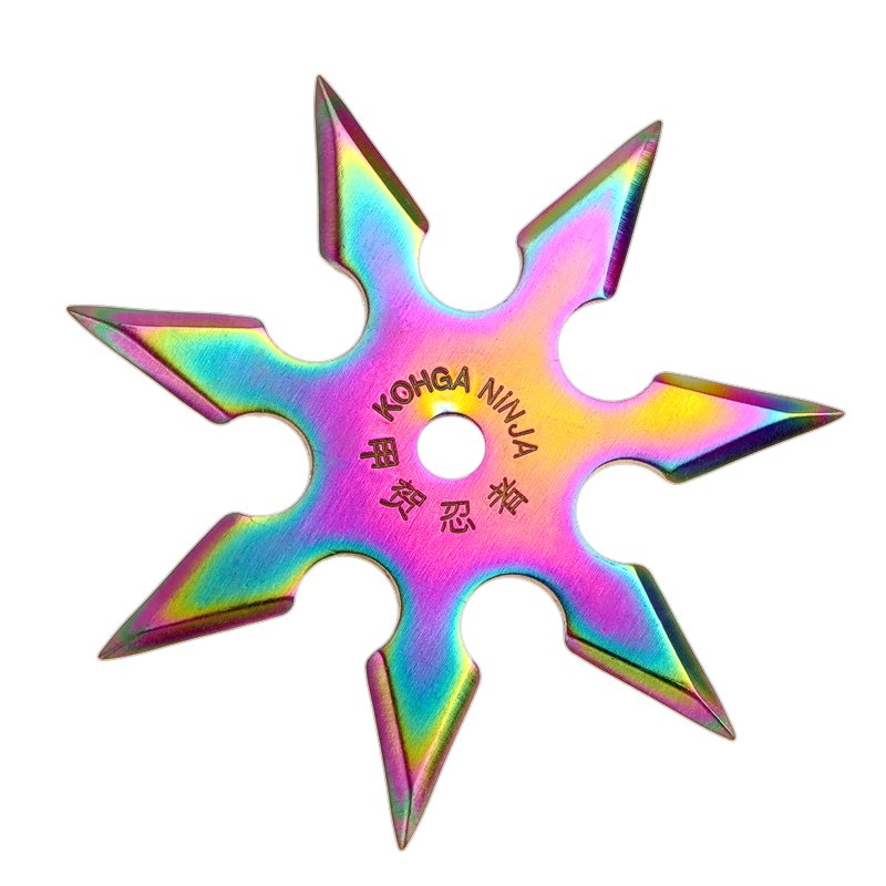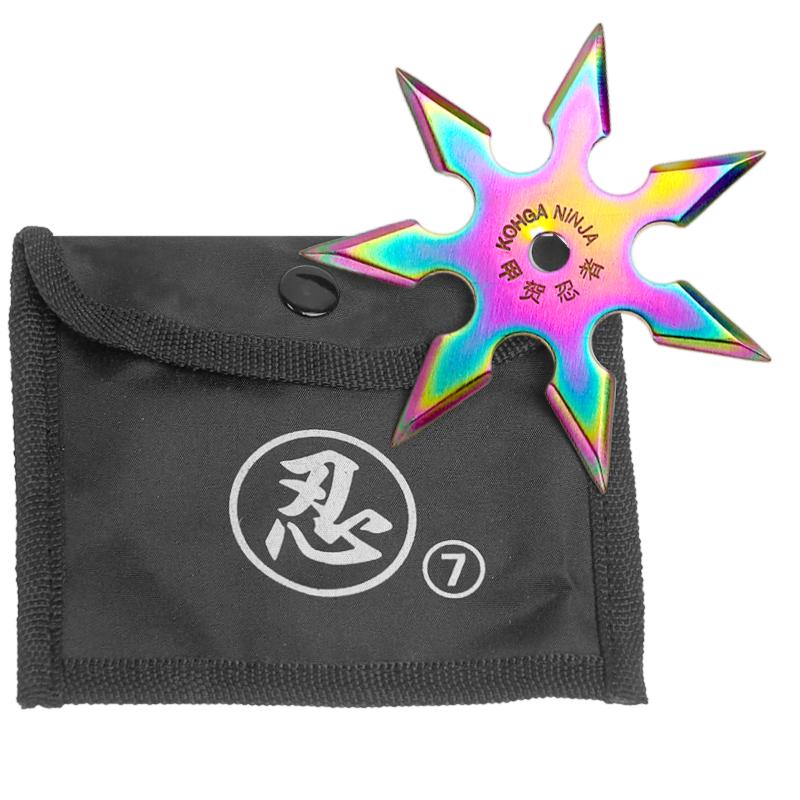 Popis: Vrhacia hviezdica Kohga Ninja so štýlovým dúhovým dizajnom, striedajúcich sa farieb. Hviezdy a hviezdice Shuriken Kohga Ninja sú vhodné na nácvik vrhacích techník, alebo športové účely. Vhodné pre začiatočníkov, ale aj pre profesionálov. Súčasťou vrhacej dúhovej hviezdice Kohga Ninja je aj paracordové čierne púzdro.