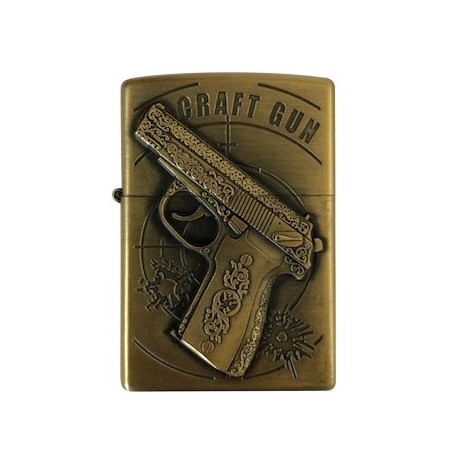 Benzínový značkový zapaľovač firmy KANTAI typu “Zipo” s 3D motívom pištole.