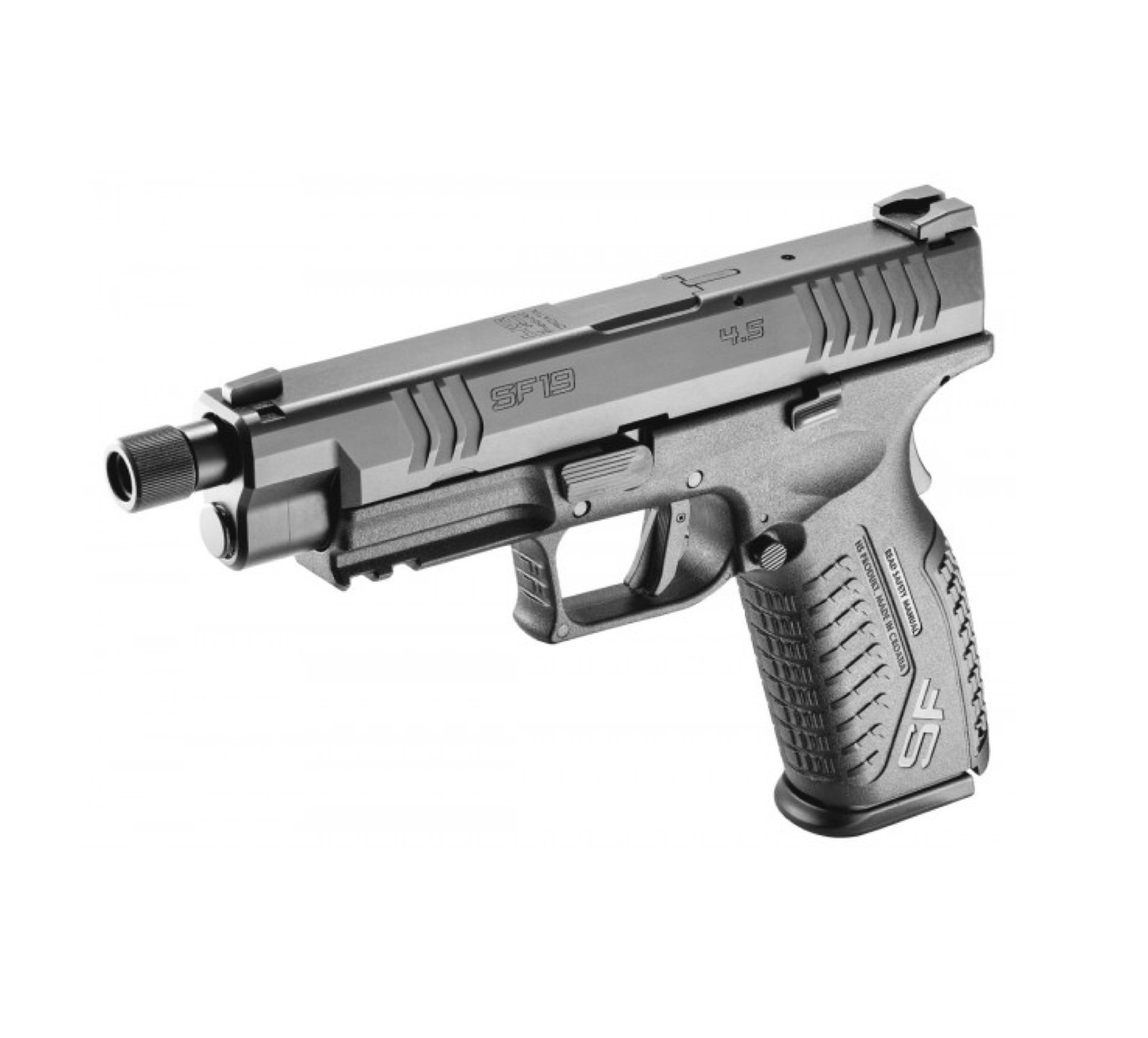 Perfektná taktická pištoľ kal. 9×19 so závitom na ústí hlavne a vylepšenou spúšťou s kratším resetom. Polymérový rám s dvojradový zásobníkom. Cieľnik a muška sú stranovo nastaviteľné, vyrobené z ocele, so zúbkovaním zabraňujúcim oslneniu. HS SF19 4.5 TB disponuje dlaňovou poistkou, poistkou spúšte, poistkou úderníka, indikátorom náboja v komore a indikátorom stavu úderníka. Medzi ďalšie vlastnosti patrí obojstranný vypúšťač zásobníka i záchyt záveru, picatinny lišta, agresívne textúrovanie rukoväte, vymeniteľné chrbty rukoväte (3 veľkosti). Zväčšený lúčik spúšte umožňuje ľahkú manipuláciu aj pri používaní rukavíc. Pištoľ je dodávaná s tromi vysokokapacitnými zásobníkmi z nehrdzavejúcej ocele (19 rán). Možnosť zakúpenia Magwell setu t.j. rozšíreného ústia zásobníkovej šachty (tzv. Jet funnel) s vysokokapacitným zásobníkom 20 alebo 22 rán.