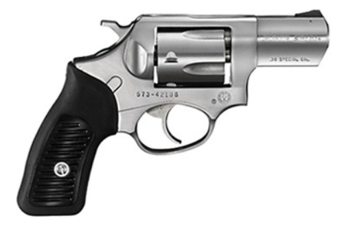 Revolver Ruger KSP-821X, nerez, kal. .38Spl + P, hlaveň 2 1/4″ (5,7cm), celkom 18,30cm, hmotnosť 737g, pevné mieridlá, pažbičky čierne gumové, 5 rán, dvojčinný.