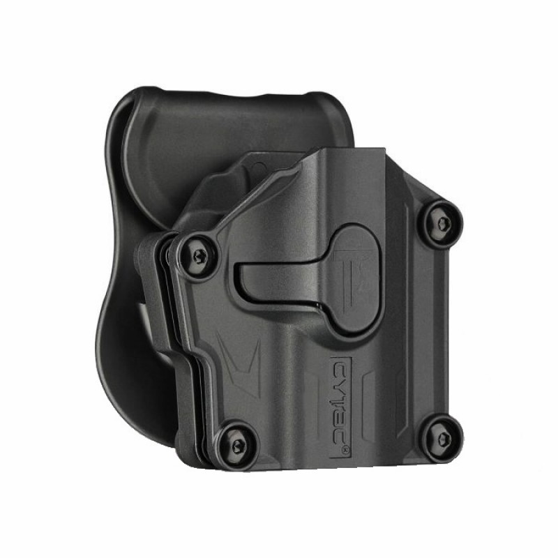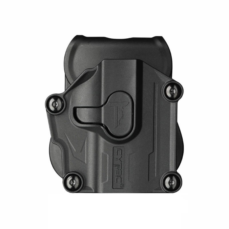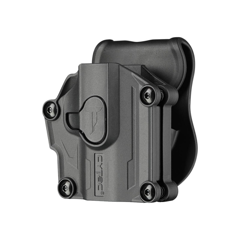 Univerzálne puzdro na pištoľ Cytac Mega-Fit s poistkou, s možnosťou rotovania o 360° a spôsobom uchytenia pomocou pádla. Vhodné až pre väčšinu kompaktných a sub-kompaktných pištolí, vďaka nastaviteľným skrutkám. Všestranné a výborné riešenie pre majiteľov viacerých druhov pištolí. Taktiež možné prehodiť na iné platformy uchytenia, ako napr. pádlo, pútko na opasok, spona na opasok, Molle, platformu na nohu Drop Leg a ramenné popruhy.