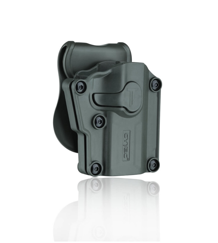 Univerzálne puzdro na pištoľ Cytac Mega-Fit s poistkou, s možnosťou rotovania o 360° a spôsobom uchytenia pomocou pádla. Vhodné až pre viac ako 80 druhov pištolí, vďaka nastaviteľným skrutkám. Všestranné a výborné riešenie pre majiteľov viacerých druhov pištolí. Taktiež možné prehodiť na iné platformy uchytenia. Pre pištole Full size  a compact.