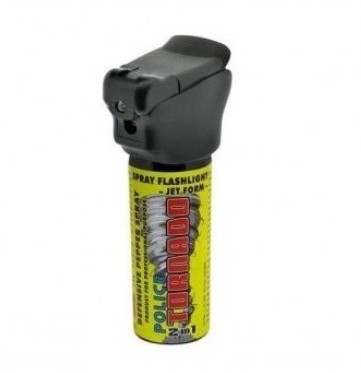Na klasickej nádobke spreja hlavica osadená supersvietivou LED diódou. Krycie viečko, zabraňujúce nechcenému výstreku. Obsahuje 2 ks batérie CR2032 a funguje zároveň ako spínač svetla. Toto “sprejové svietidlo” je možné používať ako bežné svietidlo, kedykoľvek vás zastihne tme. V prípade nebezpečenstva sa môžete jednoduchým stiskom prstu začať brániť. Ostrý lúč svetla osvieti tvár útočníka a zároveň ho oslní. Na tento výrobok bol už udelený patent v USA a EU. Sprej TORNADO je vďaka väčšiemu obsahu nádobky vhodný hlavne pre mužov, strážne služby a iné profesionálne použitie. Výstrek má charakter lúča a preto je menej náchylný k rozptylovaniu pri prípadnom miernom vetre.