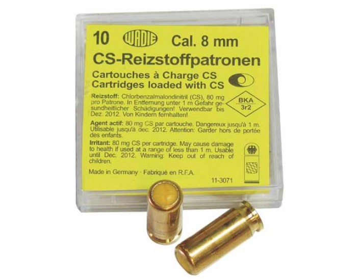 Slzotvorné obranné náboje značky Umarex s obsahom dráždivej látky CS (chlorbenzalmlondinitril) pre plynové (expanzné) zbrane v kal. 8 mm P.A. . Jeden náboj obsahuje 80 mg tejto účinnej dráždivej látky. Náboje s účinnou látkou CS nemusia účinkovať na zvieratá. Ak hľadáte náboje účinné aj na zvieratá, odporúčame prezrieť si našu ponuku slzotvorných nábojov s obsahom látky OC / Nonivamid. Balenie obsahuje 10 ks nábojov. Dosah slzotvorných nábojov po vystrelení je cca 3 až 5 metrov.