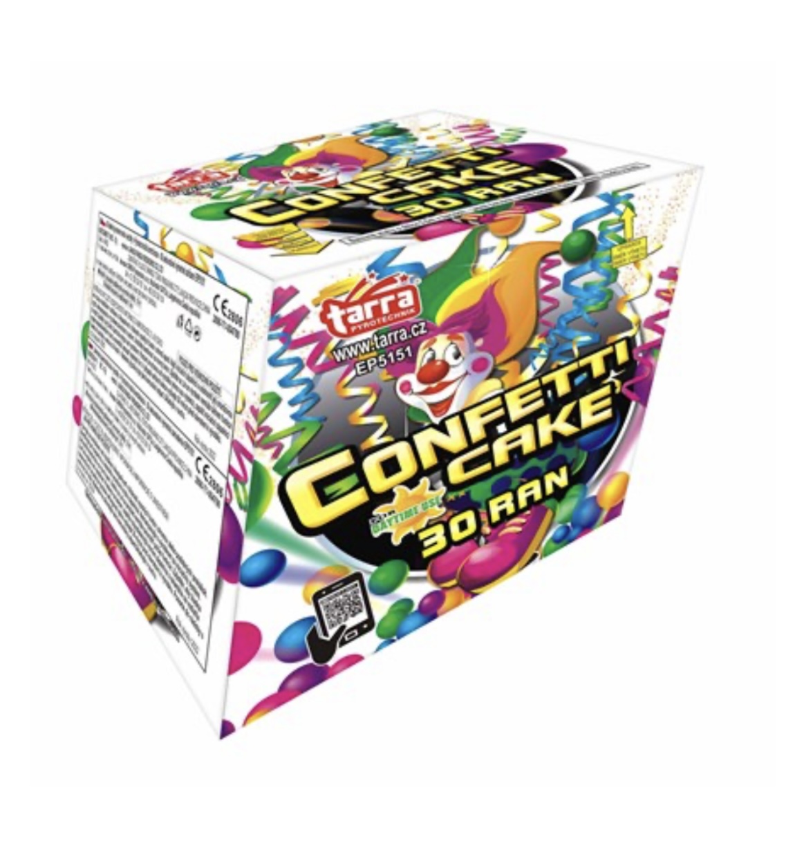 Konfetový kompaktný ohňostroj je sprevádzaný rôznymi viacfarebnými konfetovými stuhami.